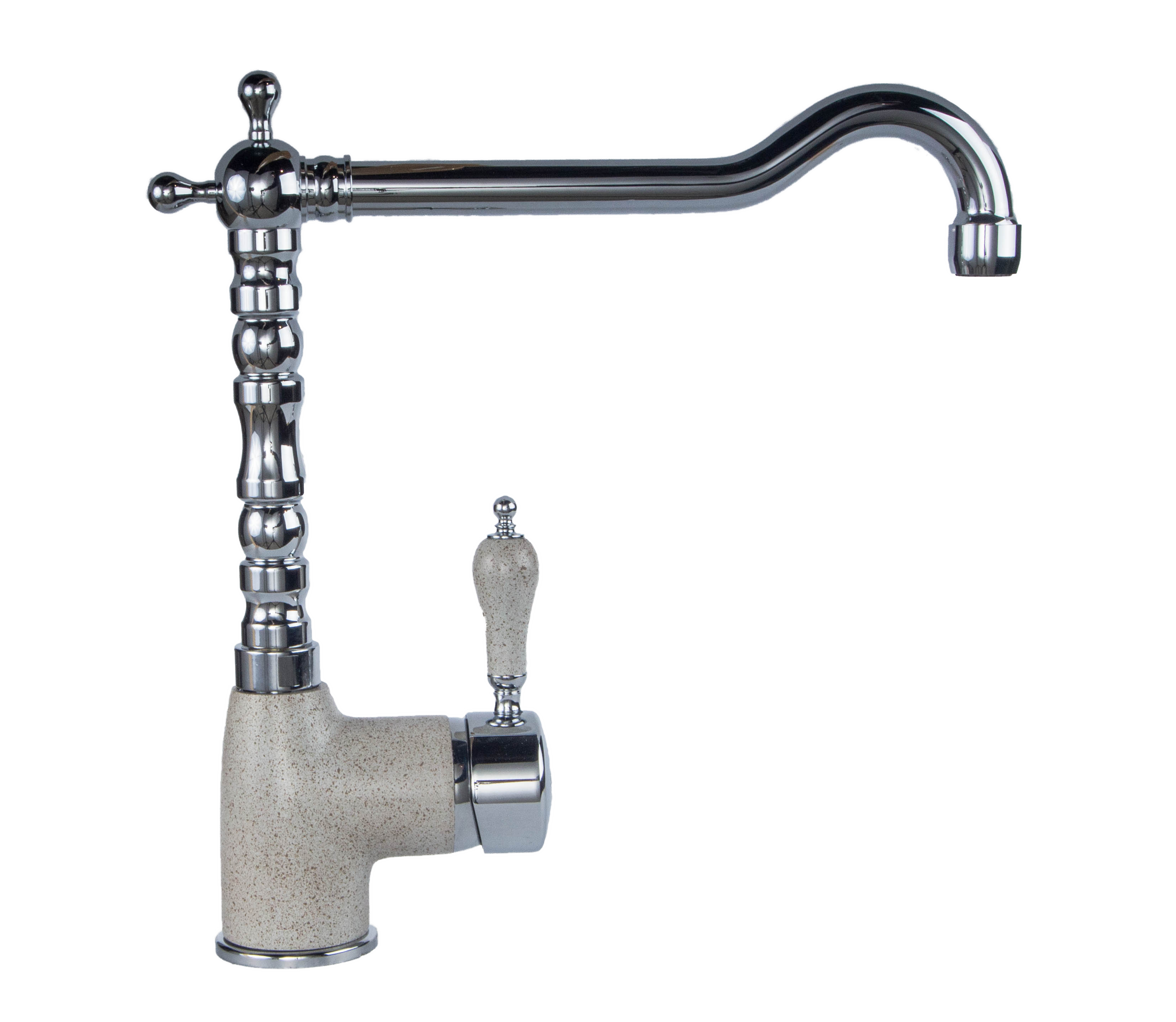 Однорычажный кухонный смеситель классического стиля Kuppersberg Paris KG400 на 1/2 с вращающимся высоким изливом. Прекрасно сочетается с классическими мойками и фурнитурой из хрома и состаренной бронзы. Угол поворота 360°. Картридж с керамической буксой на 40. Легкое подключение гибким шлангом с гайкой на 3 ½ , длинной 450 мм.