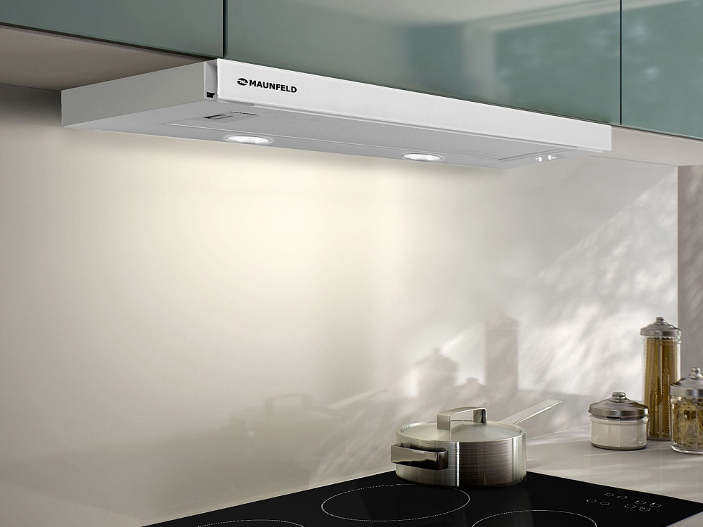 Встраиваемая вытяжка Maunfeld CLYDE С 60 WHITE. Производительность 600 м3/час, 2 скорости, колыбельное управление, алюминиевый фильтр, выдвижная модель, фронтальная панель из белого стекла, освещение галоген 2х20 Вт, уровень шума 52,4 Дб, мощность мотора 2х160 Вт, диаметр воздуховода D=120 мм, вытяжка/воздухоочиститель, Выдвижная, встраиваемая модель.