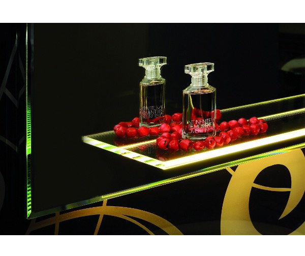 Зеркало серебряное Dubiel Vitrum "Dora" с прикреплённой подсвеченной полкой из толстого стекла. В верхней части зеркала - горизонтальная планка, декор "мороз", подсвеченная с задней стороны набором люминисцентых ламп.
